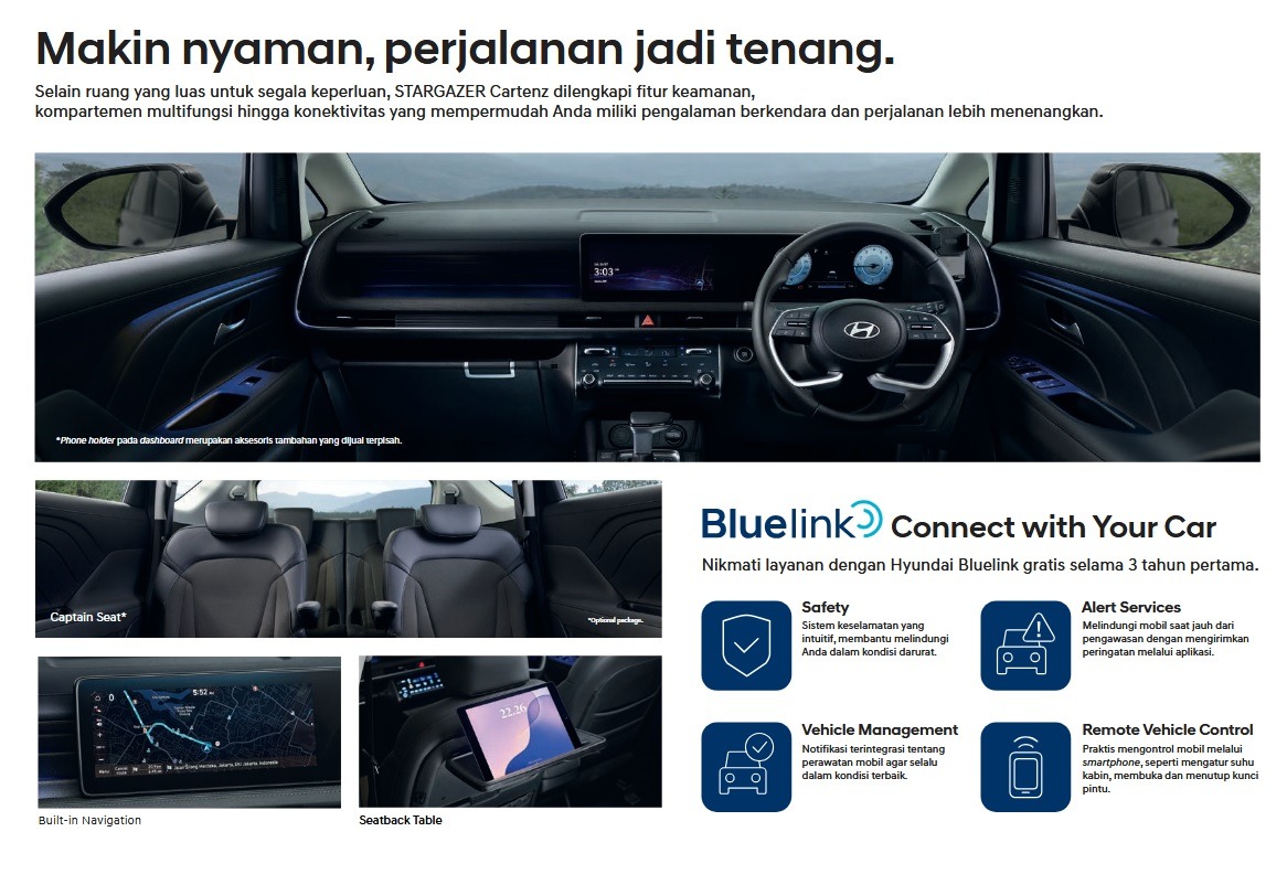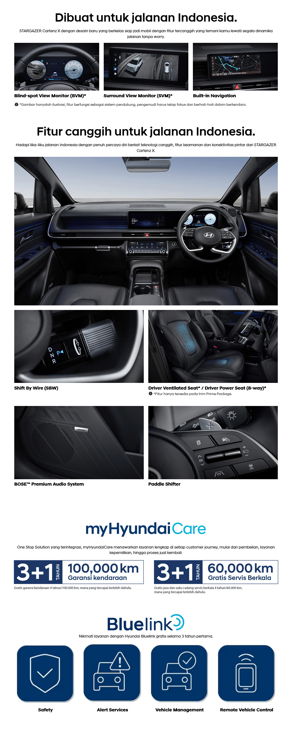Hyundai STARGAZER Cartenz merupakan MPV keluarga yang menonjolkan kenyamanan dan kecanggihan fitur. Penyegaran pada desain eksterior depan dan belakang dipadukan dengan teknologi modern seperti Smart Cruise Control serta navigasi bawaan yang tetap berfungsi bahkan saat sinyal hilang. Sistem keamanan Hyundai SmartSense—termasuk BCA, LKA, dan FCA—menjadikan mobil ini pilihan yang aman untuk perjalanan sehari-hari maupun liburan keluarga. Interiornya luas, dilengkapi captain seat, seatback table, serta bagasi berkapasitas hingga 585 liter yang mampu memuat stroller hingga koper besar. Dirakit secara lokal dengan kandungan TKDN di atas 40%, Cartenz menjadi simbol kemajuan otomotif di Indonesia.
